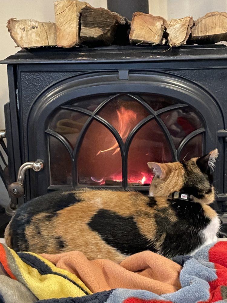急に寒くなりました。暖炉に火を入れたら一番良い場所を取られました。