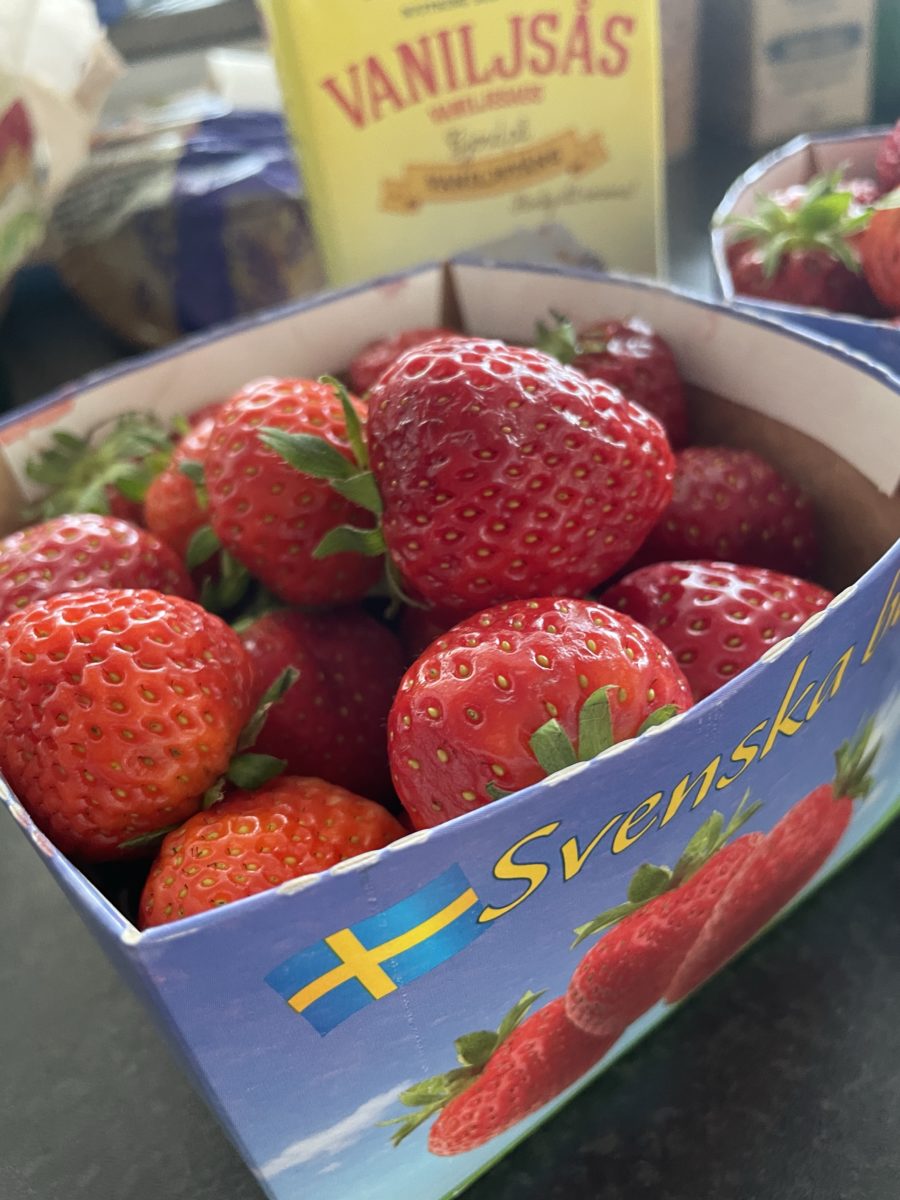 スウェーデンの夏至祭で絶対食べるもの…それは苺です。道路のあちこちに手書きの苺看板🍓 パラソルの下で売り子しているのはほぼ子供です。よいお小遣いになるとか?!支払いはキャッシュレスのスウィッシュという携帯のQRコード払い